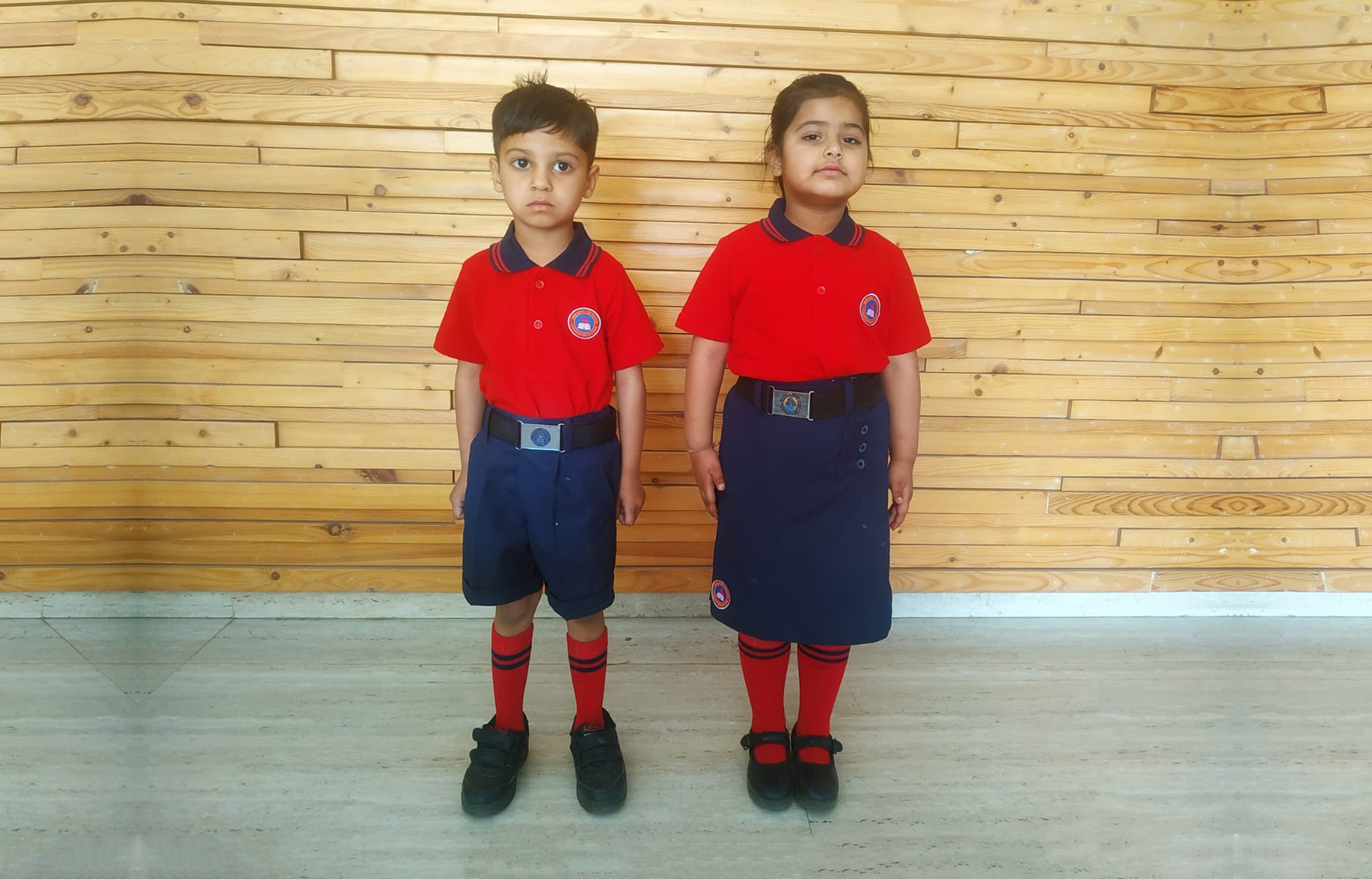 | Nursery, L K.G & U.K.G. (For Boys and Girls) | 1. Navy Blue Shorts/Skirts 2. Half Sleeve Red T-Shirt having Navy Blue Collar with School logo. 3. Red Socks with two Blue Stripes 4. Black Shoes with laces/ buckles. 5. School Belt 6. Black Hair Band / Ribbons. (Girls) |